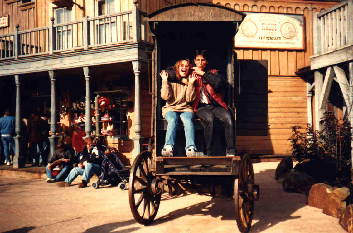 amiga, Laura Moreno. Esta foto está hecha en el oeste, como se puede ver. Fue hecha en EuroDisney-París. Allí vimos esta carreta y yo hice el papel de bandolero. |
